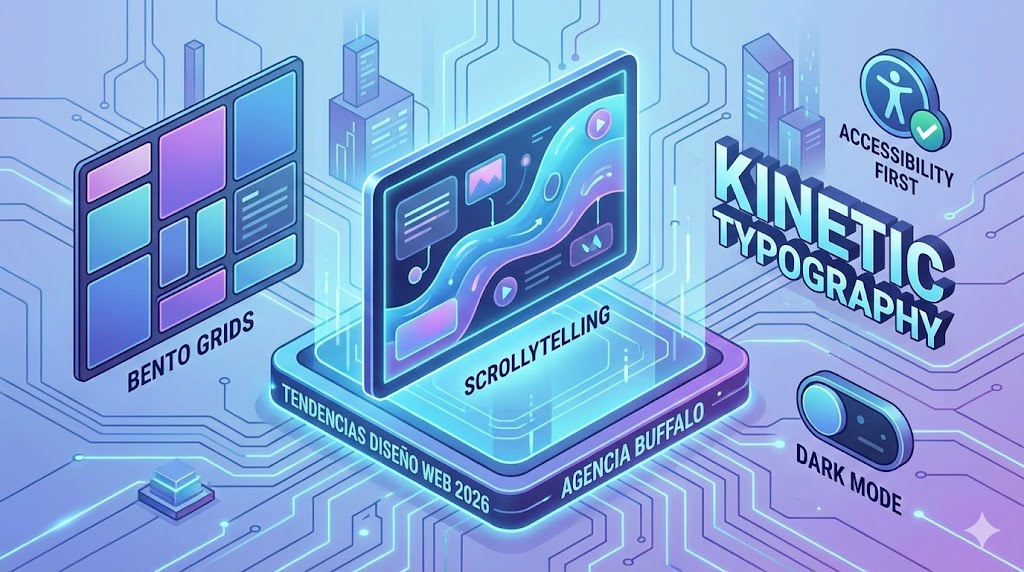 El sitio web ha dejado de ser una simple tarjeta de presentación digital para convertirse en el cuartel general de cualquier estrategia de negocio. En un mundo saturado de impactos visuales efímeros en redes sociales, la página web es el único espacio donde una marca tiene el control absoluto de la narrativa, el tiempo y la experiencia del usuario. Mirando hacia el 2026, en Agencia Buffalo identificamos un renacimiento del diseño web, donde la creatividad visual vuelve a cobrar protagonismo, pero siempre supeditada a un rendimiento técnico impecable.